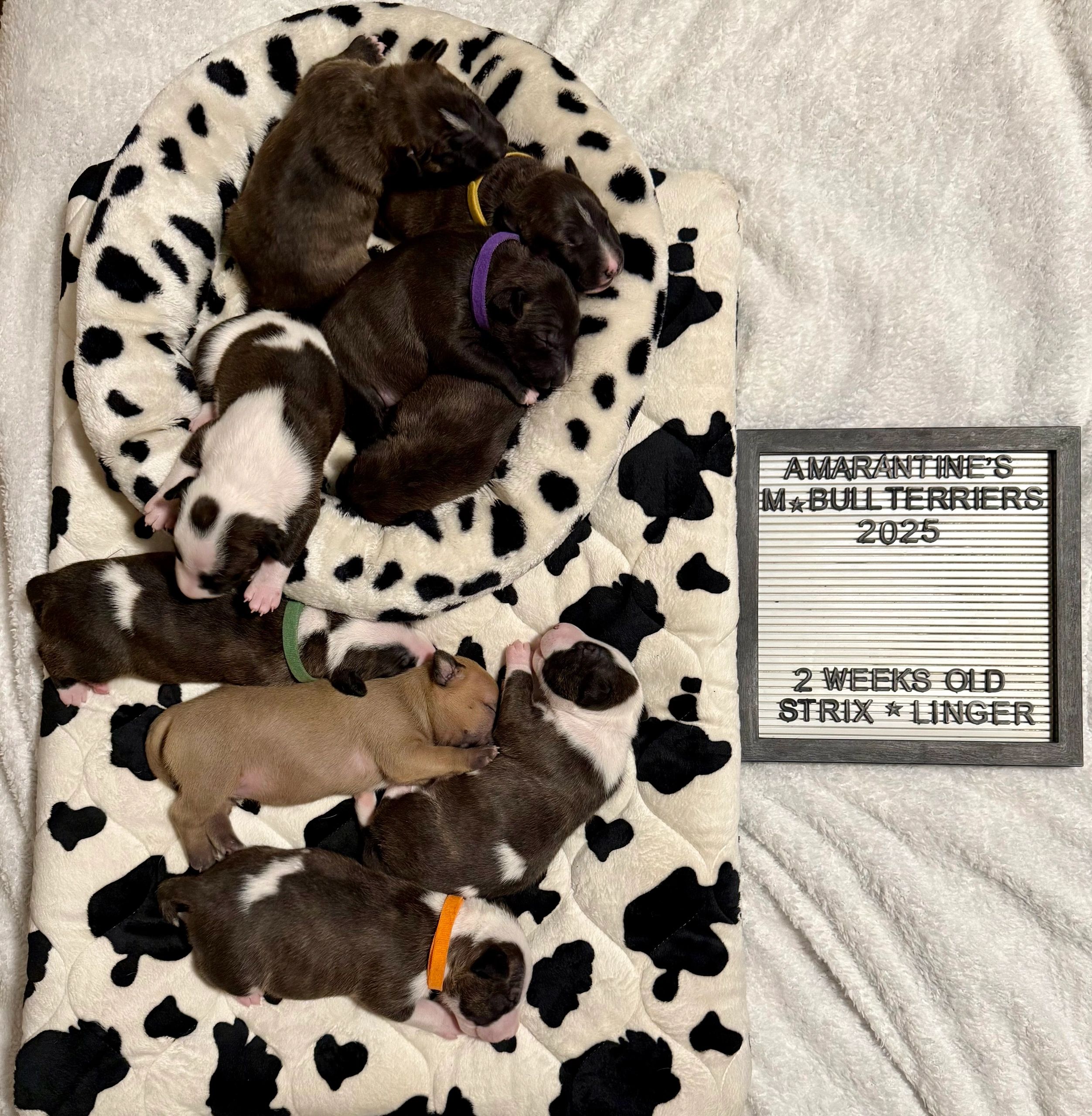 Sept.17 2025 Strix X Linger welcomed 9 beautiful Miniature Bull Terrier Puppies into the world. (3 available)